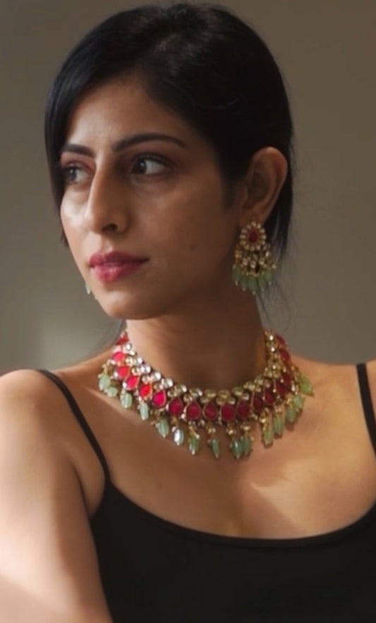 Traditional Kundan Choker Necklace Set with Earrings, Pink and Mint Green Beads, Gold-Toned