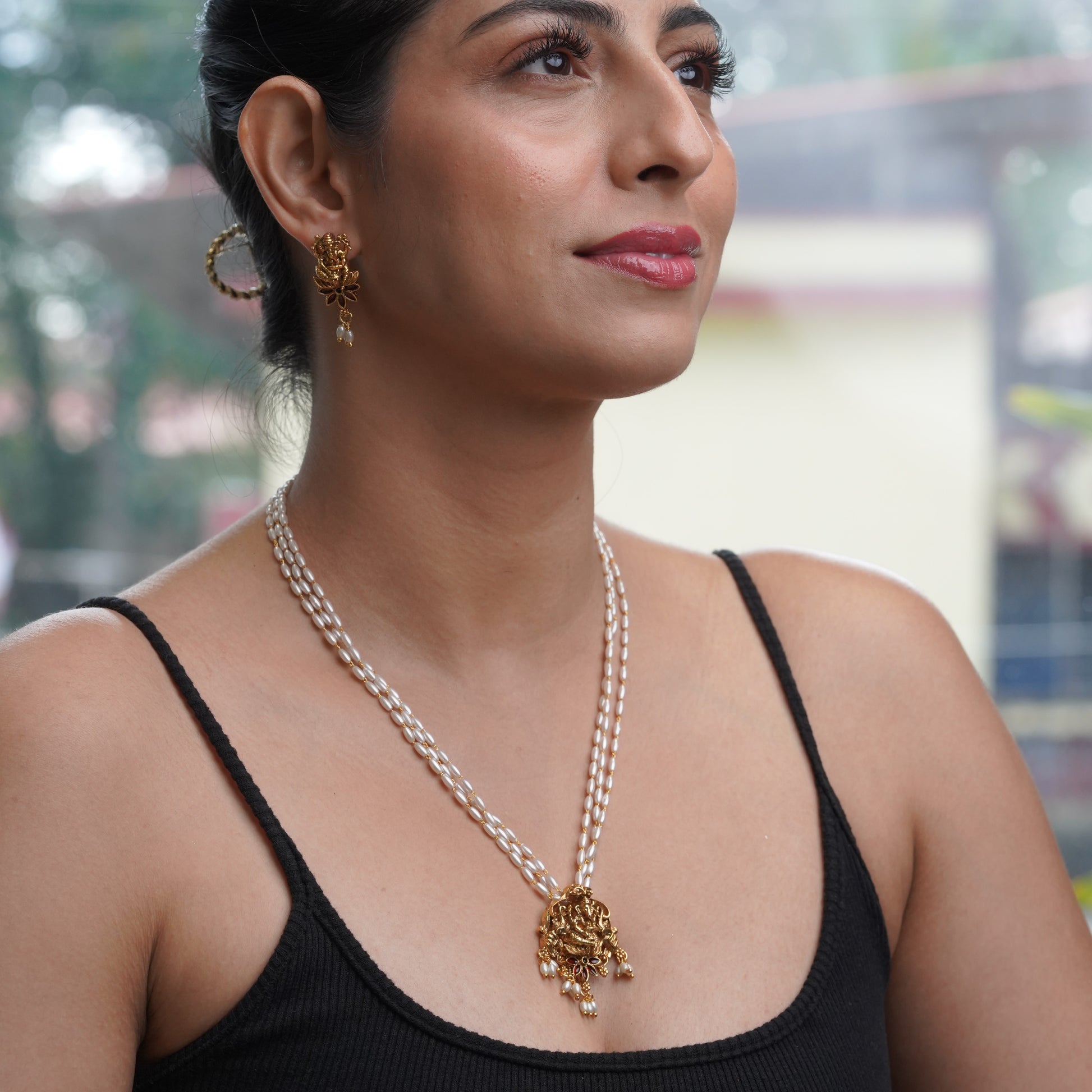 Fresh Water Rice Pearl with Ethnic Lord Ganesh Pendant Jewelry Set