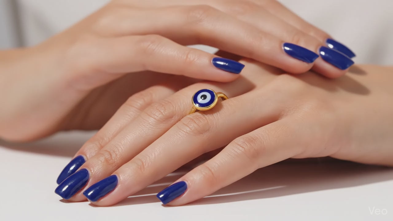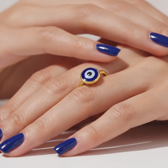 A modern take on a timeless talisman. This ring balances a sleek, circular Evil Eye motif with a handcrafted hammered texture. Finished in a rich gold hue, it’s the perfect everyday accessory for those who appreciate jewelry with a deeper meaning.